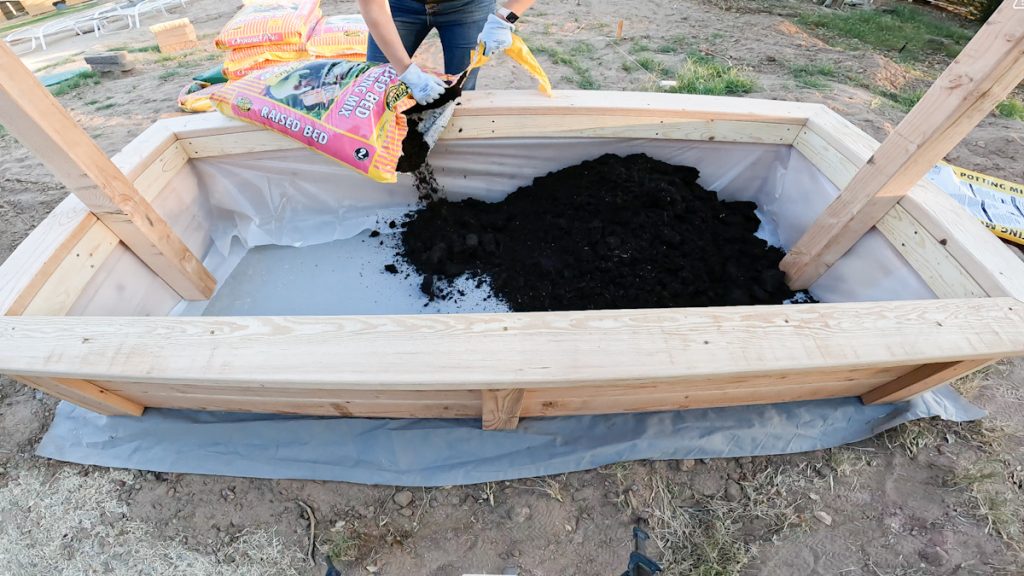 Next, we lined the bottom of the bed with landscape fabric. This helps prevent weeds from growing up through the soil.