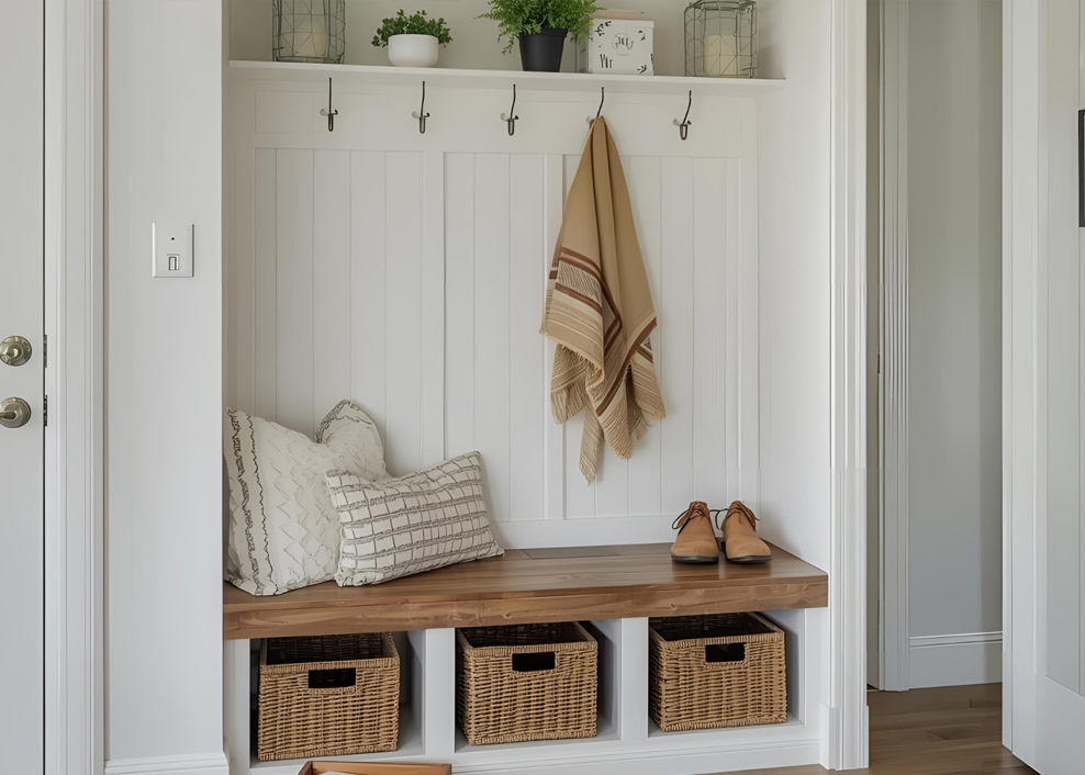 Floating shelves, mudroom benches, and alcove built-ins.